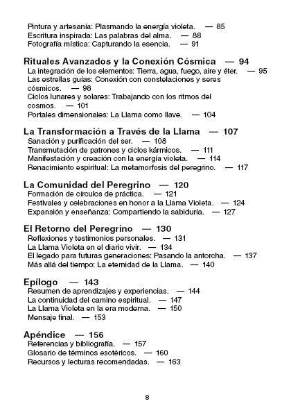 Cada capítulo está cuidadosamente estructurado para guiarte en un viaje de autoconocimiento, sanación y conexión cósmica. Descubre cómo la Llama Violeta puede transformar no solo tu vida, sino también el mundo que te rodea, al elevar tu vibración y contribuir al bienestar colectivo.