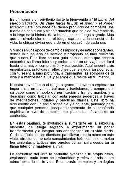 Escrito de manera accesible, «El Libro del Fuego Sagrado» está diseñado para que cualquier persona, independientemente de su trasfondo espiritual, pueda beneficiarse de sus enseñanzas. A medida que avances en este viaje, descubrirás cómo el fuego sagrado puede ser tu compañero en el camino hacia una vida de mayor luz, amor y poder interior.