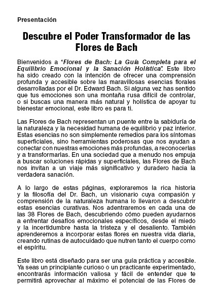 Disponible en formato PDF, «Flores de Bach: La Guía Completa para el Equilibrio Emocional y la Sanación Holística» es ideal tanto para principiantes que buscan una introducción a las Flores de Bach como para practicantes experimentados que desean profundizar su conocimiento y aplicación de estas esencias curativas.