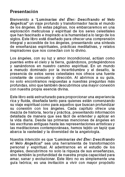 Disponible en formato PDF, «Luminarias del Éter: Descifrando el Velo Angelical» es más que un libro, es una invitación a vivir con mayor propósito y a reconocer las señales y mensajes que los ángeles nos envían para guiar nuestro camino espiritual.
