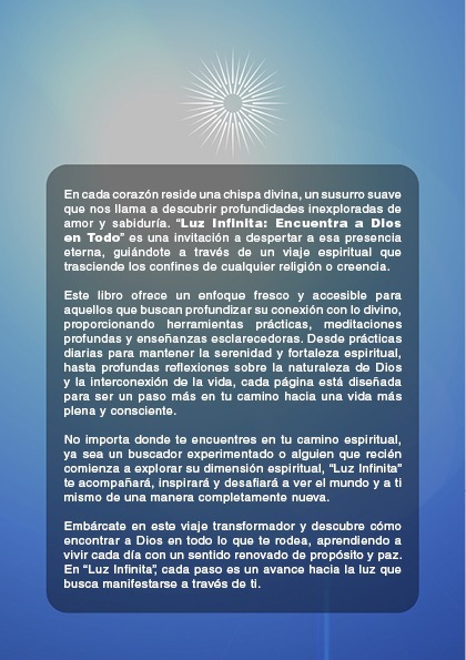 Explora la presencia divina en todos los aspectos de tu vida con "Luz Infinita: Encuentra a Dios en Todo". Disponible en formato PDF, esta guía espiritual te ofrece herramientas para integrar la espiritualidad en tu vida diaria y transformar tu camino hacia la plenitud.