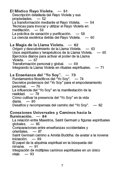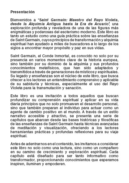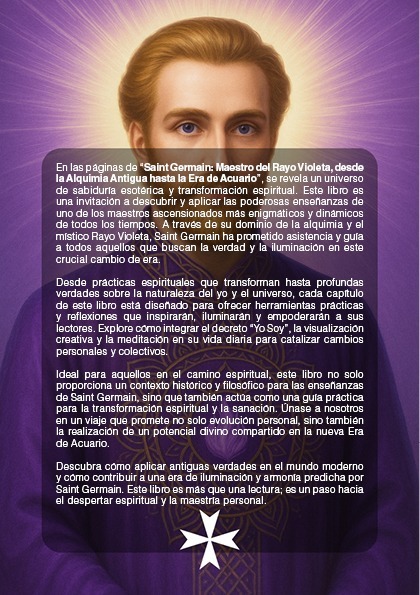 «Saint Germain: Maestro del Rayo Violeta» ofrece un entendimiento profundo de las enseñanzas de Saint Germain, incluyendo técnicas avanzadas de meditación, visualización y la práctica de la Llama Violeta. Es ideal para cualquier persona que desee profundizar su camino espiritual y aplicar principios que promuevan el crecimiento personal y el cambio positivo en el mundo.